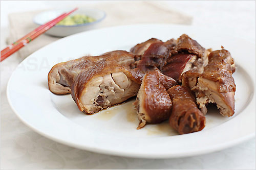 3. Tắt bếp và để gà nguyên trạng thái như vậy, ngâm trong nước tương vòng vài giờ để thịt gà ngấm đều gia vị. Khi nào ăn, cắt đùi gà thành từng miếng nhỏ tùy theo sở thích của bạn và dùng ngay với nước chấm và gia vị bạn ưa thích.